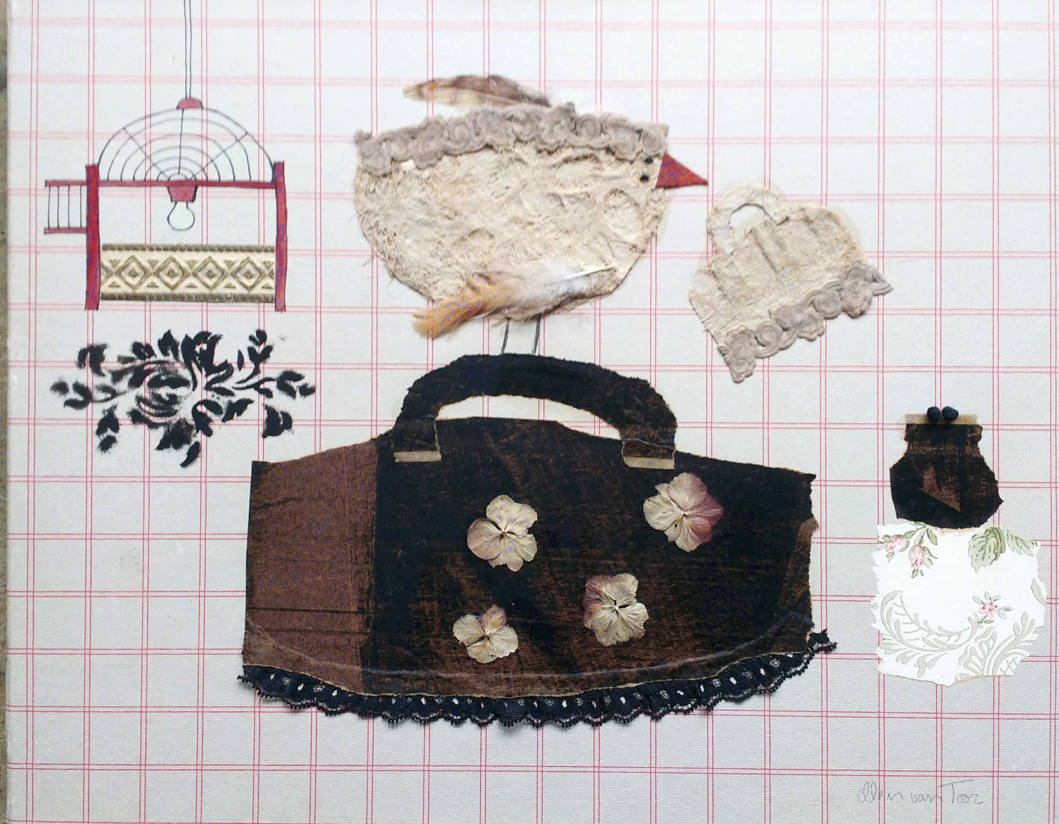 vogels en tasjes schilderijcollage 40×50